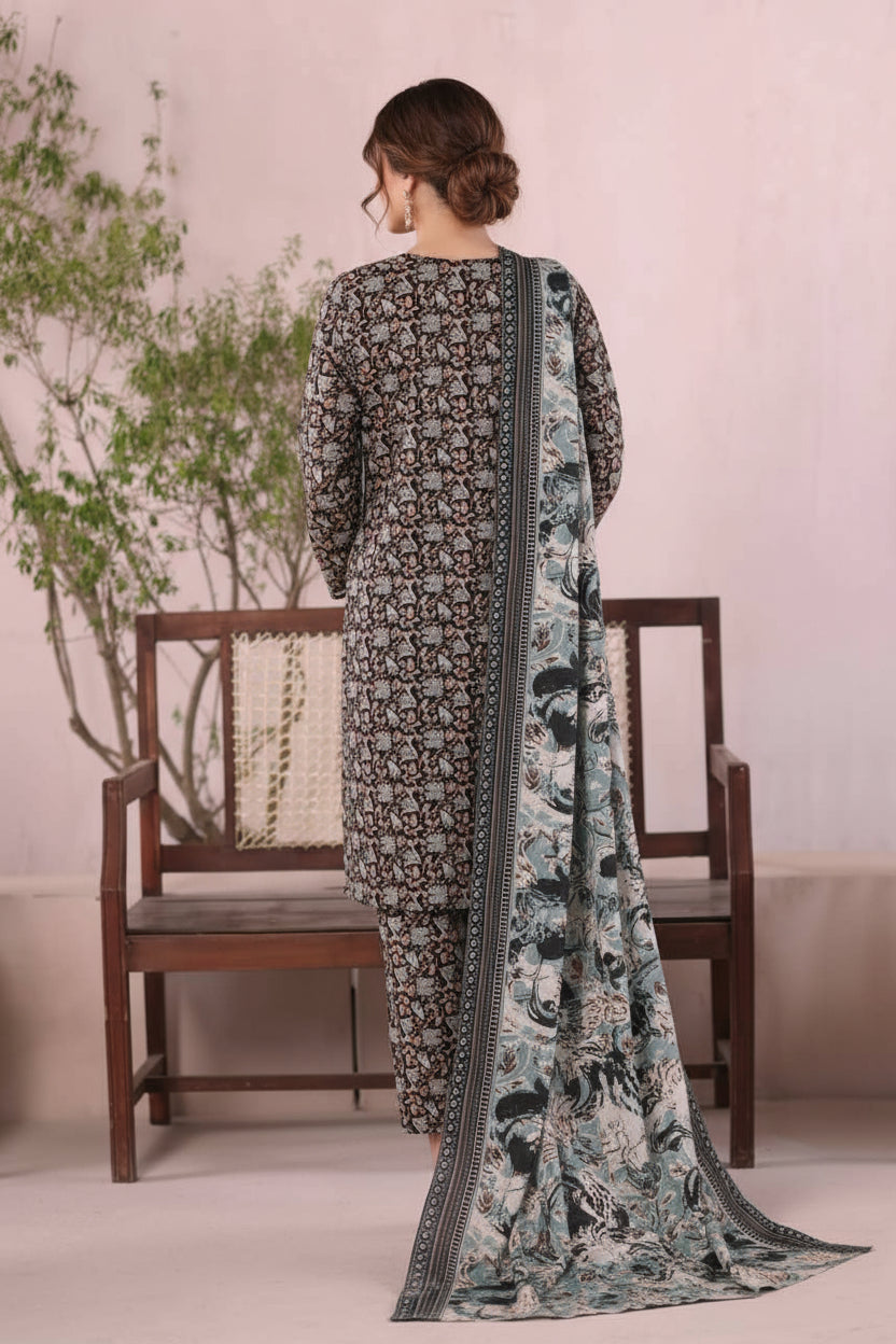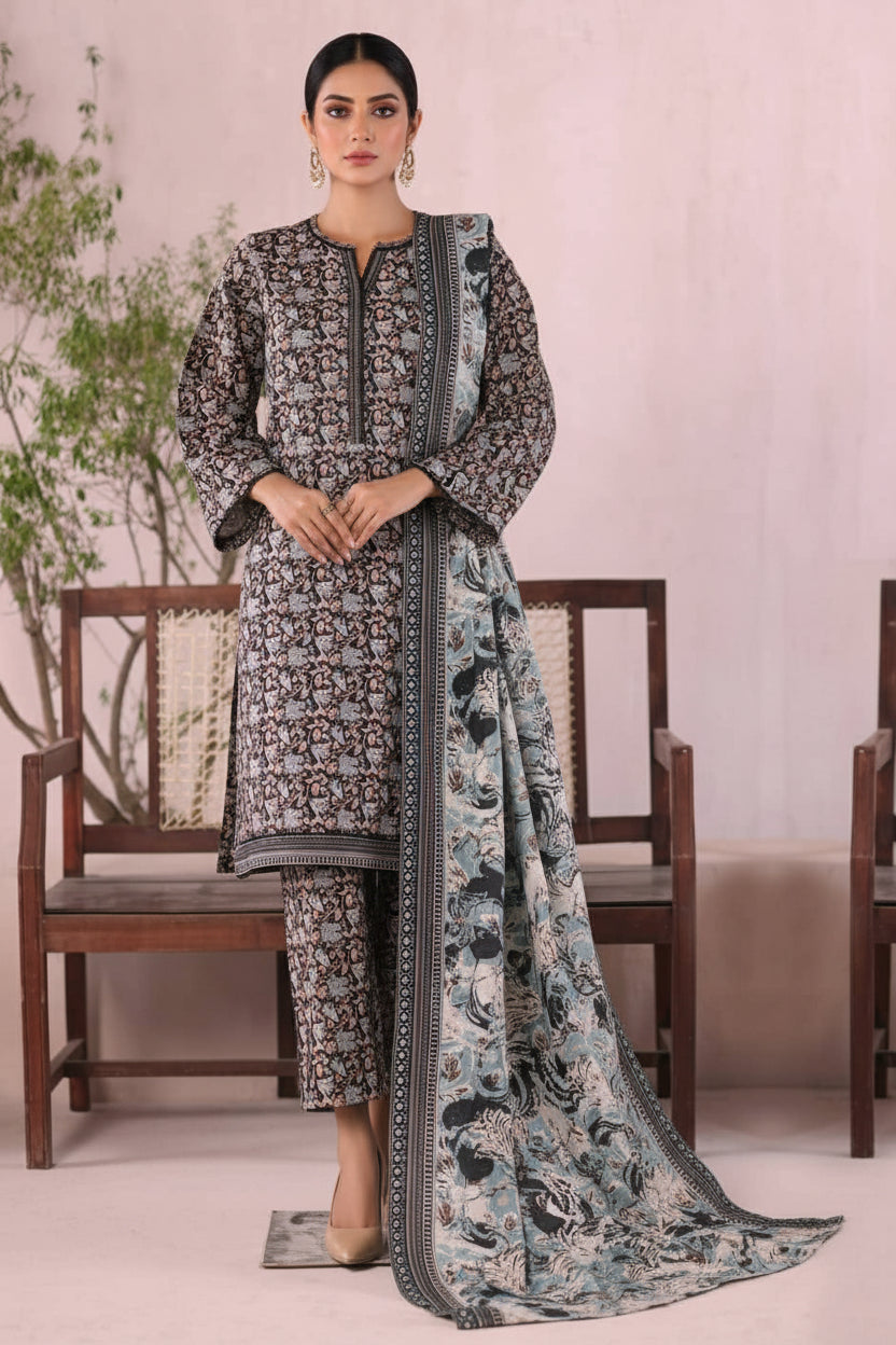 Discover the elegance of this 3-piece printed Khaddar dress collection by Bin Saeed, featuring a striking black and coastal green color palette. Crafted from premium Khaddar fabric, this ready-to-wear ensemble combines traditional Pakistani style with contemporary design. The set includes a beautifully printed shirt, coordinating dupatta, and matching trousers, perfect for casual gatherings or everyday wear. Khaddar's natural breathability makes it ideal for Pakistan's climate, while the quality construction ensures durability and comfort. Embrace timeless sophistication with this versatile wardrobe essential from Bin Saeed.